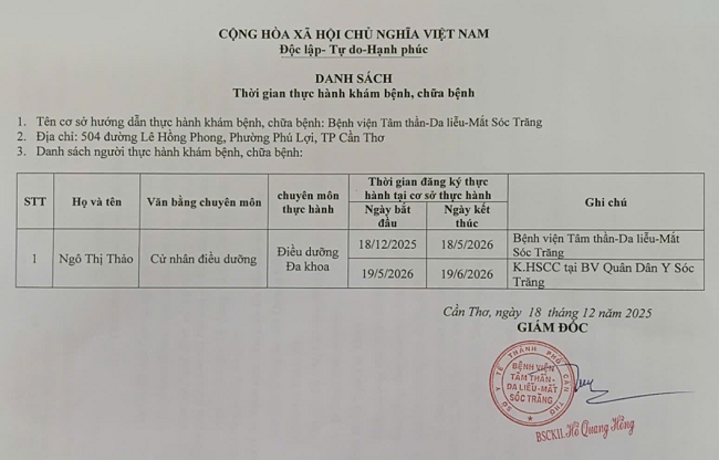 DANH SÁCH THỜI GIAN THỰC HÀNH KHÁM BỆNH, CHỮA BỆNH (18/12/2025)